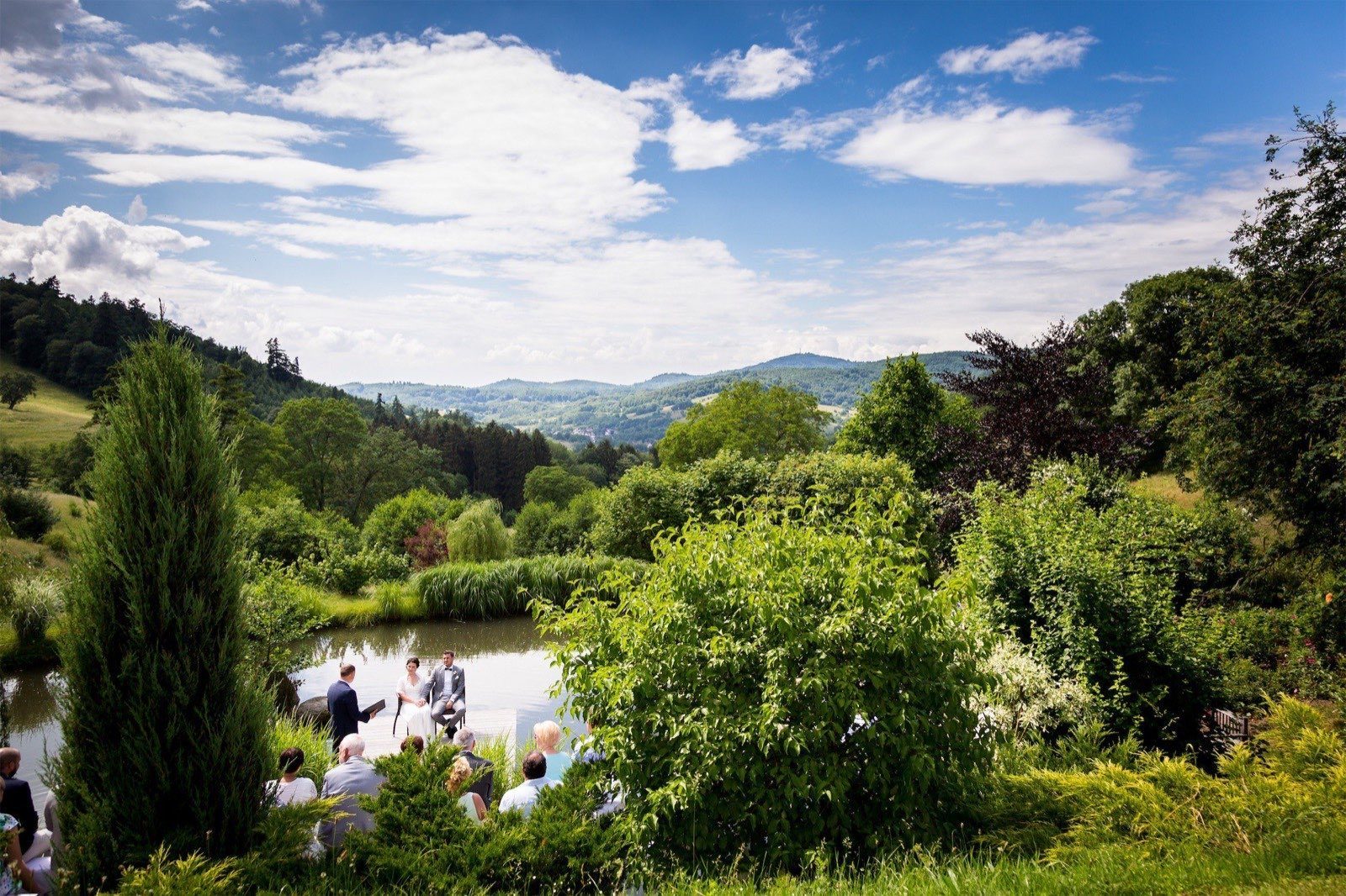 Malerisch liegt er da, der See des Hofgut Hohensteins, umgeben von dunklen Bäumen und einem gigantischen Weitblick über die Hügel des Odenwalds. Kleine weiße Wölkchen schwebten über den Himmel („das Wetter wird gut werden“, hatte Benni vorher versprochen, „da mache ich mir gar keine Gedanken!“), als die Stimmung sich zum Zerreißen spannte und DER Moment vor uns lag: Leise Musik erklang, als Romina von ihrem Vater vorbei an ihrer Familie und ihren Freunden auf den Steg geführt wurde, auf dem Benni auf sie wartete. Was für ein Moment, was für ein Auftakt für eine unvergessliche Hochzeit!
